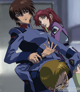 The line comes at one of those... complicated adult moments, (not sure what I mean? Ask your parents!) but as a setup, Kira's lover, Flay Allster, is attempting to get close to him in order to use a Coordinator to further her vendetta against Coordinators. To strengthen (!?) their relationship, Flay shuns Sai Argyle, another crew member aboard the Archangel (an Atlantic Federation mobile assault ship) who is her fiancé; things get messy when Flay officially breaks it off and Kira, who is by now completely smitten, effortlessly arm locks Sai as he attempts to pursue the couple. (← You just know Flay wishes she could pump a fist in victory at this moment.)
