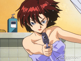 And last, there's Ennil El of After War Gundam X. The most-exposed (!?) young lady of Gundam, she's the daughter of former Space Revolutionary Army Rear Admiral Nada El and an Earth woman. Already famed as a Gundam pilot, she encounters Garrod Ran (the hero of After War Gundam X) and, taking an interest in not only him but his Gundam X, lures him to a bar where she attempts to seduce him only to be shot down (nearly literally, a huge blow to her pride!) Afterward, she continues her assault on the Freeden, (the ship carrying Garrod) reaching almost stalkerish levels of obsession. (Yep. Scary.)