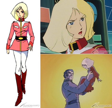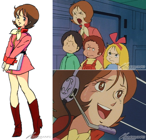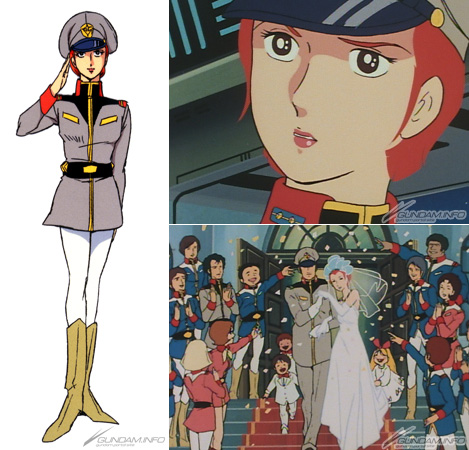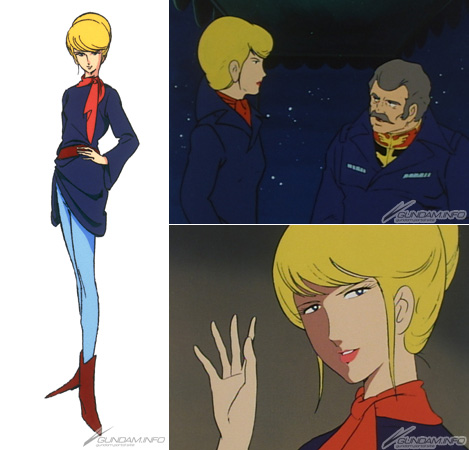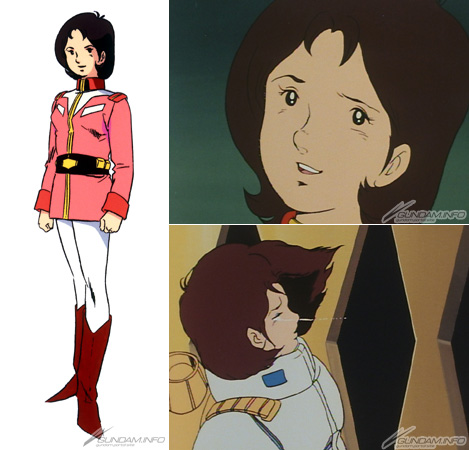 Engaged to a man named Cameron Bloom, she rejects not only his advances but aid for the White Base during a visit to Side 6, and is slapped by crew member Lt. (JG) Sleggar Law for it. (Oh my!) Later, she begins to fall for Sleggar's dashing demeanor... But that goes nowhere, and after the war she weds Bright Noa ( White Base's captain.)