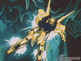 Unlike Hyaku-Shiki, all it does is transform: its armor is stripped down to a harness of three pipes (?) crossing the chest, ans while it fares better in space it still has plenty of problems like complete ineffectiveness in melee.