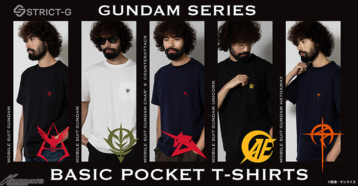 Cinque T-shirt della serie STRICT-G Gundam con tasche saranno in vendita il 5 agosto! Hanno semplici ricami sul petto!