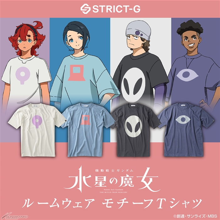 Quattro tipi di T-shirt con motivo roomwear diMobile Suit Gundam LA STREGA DI MERCURIOsarà in vendita sabato 19 agosto da STRICT-G, un negozio di abbigliamento che incorpora la visione del mondo di Gundam.Saranno 6.600 JPY (tasse incluse) ciascuno.