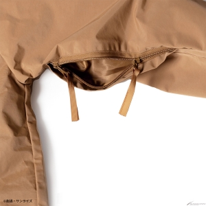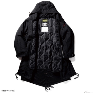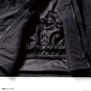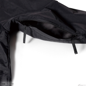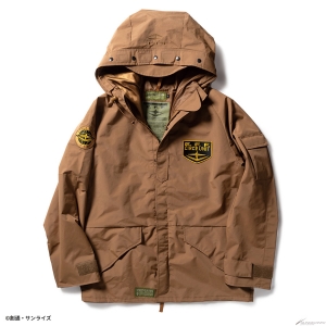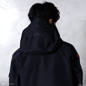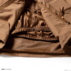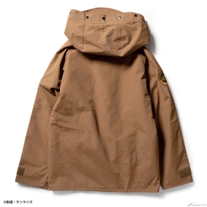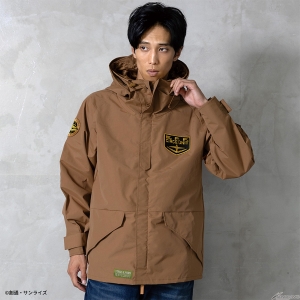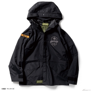 Gli emblemi sul petto sinistro / manica destra e il ricamo sul cappuccio riflettono il mondo di Gundam.La giacca è disponibile in due modelli: il modello MAFTY in nero con un accento di arancione e il modello E.F.F. in marrone coyote con un accento di giallo.Modello in nero con un accento di arancione, e il modello E.F.F. in coy