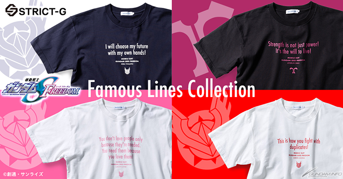 Four progetti diMobile Suit Gundam SEED FREEDOMLe T-shirt a maniche corte Famous Lines sono disponibili per il pre-ordine presso il negozio online STRICT-G di Premium Bandai al prezzo di 4.730 JPY ciascuna (tasse incluse) a partire dalle 13:00 (JST) di venerdì 31 maggio.