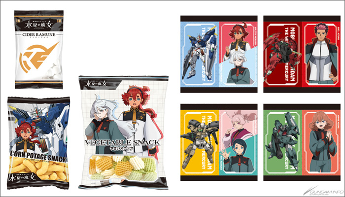 Questi pacchetti includono un assortimento di caramelle al sidro Ramune, snack Corn Potage e snack vegetali.Ogni pacchetto ha disegni basati sul marchio del titolare, Suletta, Miorine e Gundam Aerial Rebuild daMobile Suit Gundam LA STREGA DI MERCURIO.