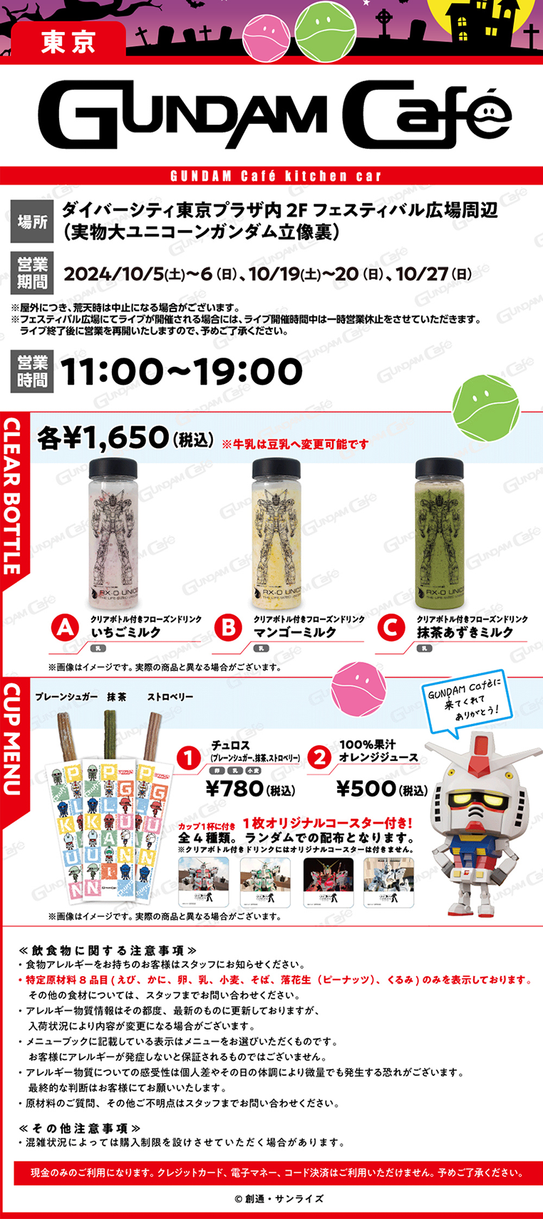 È stato anche annunciato che i food truck del GUNDAM Café saranno aperti dietro la statua dell'Unicorn Gundam a grandezza naturale a Tokyo sabato 5, domenica 6 ottobre, sabato 19 ottobre, domenica 20 ottobre e domenica 27 ottobre. I food truck serviranno bevande ghiacciate in bottiglie trasparenti con il design della statua dell'unicorno a grandezza naturale, tazze di churros e succo d'arancia al 100% con sottobicchieri originali.