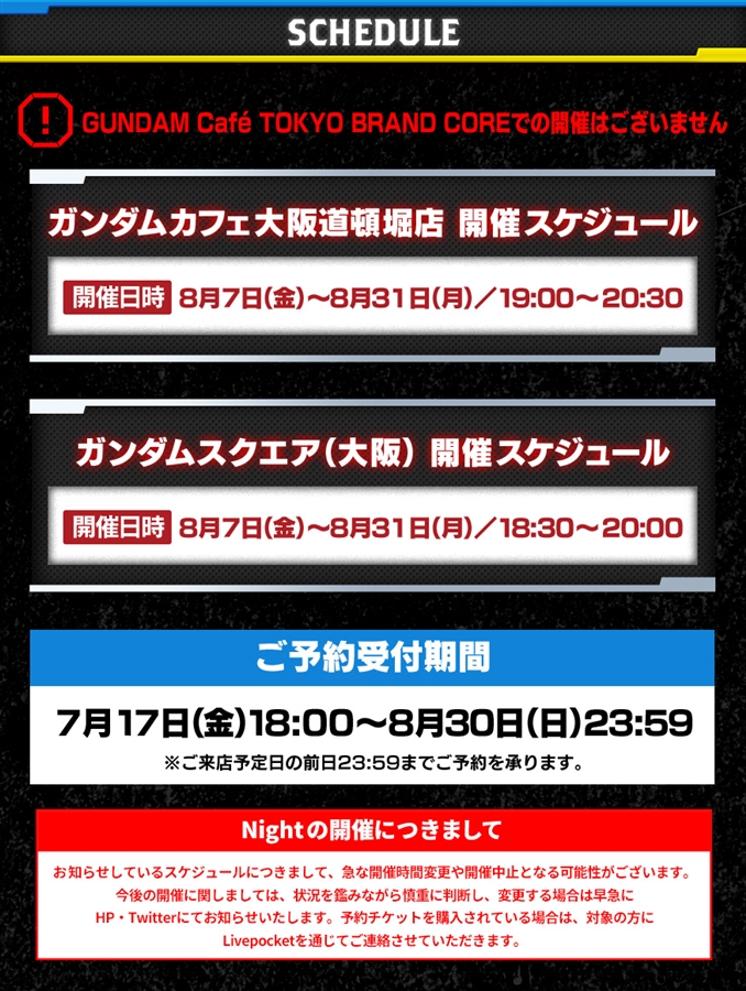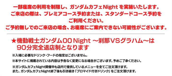 Questo evento notturno si concentra su Setsuna F. Seiei e Graham AkerMobile Suit Gundam 00.Le scene iconiche con i due sono esposte nei negozi.. Ci sono anche bevande e cibo esclusivi per eventi, selezioni di caffè dove i visitatori possono guardare proiezioni di scene iconiche della serie, e gli eventi del tempo libero dove ogni sedile può essere godutoserie he, e gli eventi del tempo libero dove ogni sedile può essere goduto. I visitatori possono anche vedere diversi