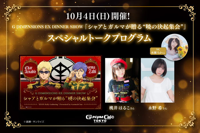 ⇒[Le prenotazioni iniziano alle 12:00 PM (JST) di mercoledì 30 settembre]Programma speciale Talk G dimensioni EX cena spettacolo "ZEON raduno raduno" presentato da Garma & char il 4 ottobre