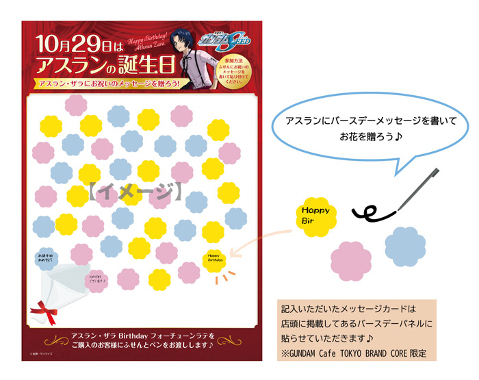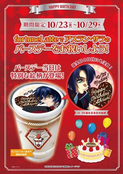 Acquista il Athrun Zala compleanno fortuneLatte e Scrivi un messaggio sulla cartolina inclusa con la bevanda.Posizionarlo sul pannello di compleanno al fortuneLatte Café, che sarà visualizzato fino a giovedì 29 ottobre.