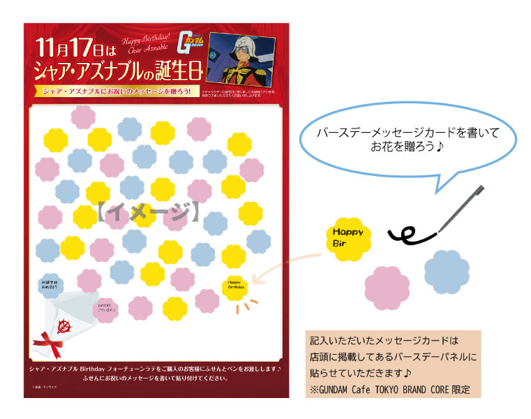 Acquista il Char Aznable compleanno fortuneLatte e scrivere un messaggio sulla scheda del messaggio incluso con la bevanda.Posizionarlo sul pannello di compleanno al fortuneLatte Café, ma sii veloce!la scheda del messaggio inclusa con la bevanda. Posizionarlo su th