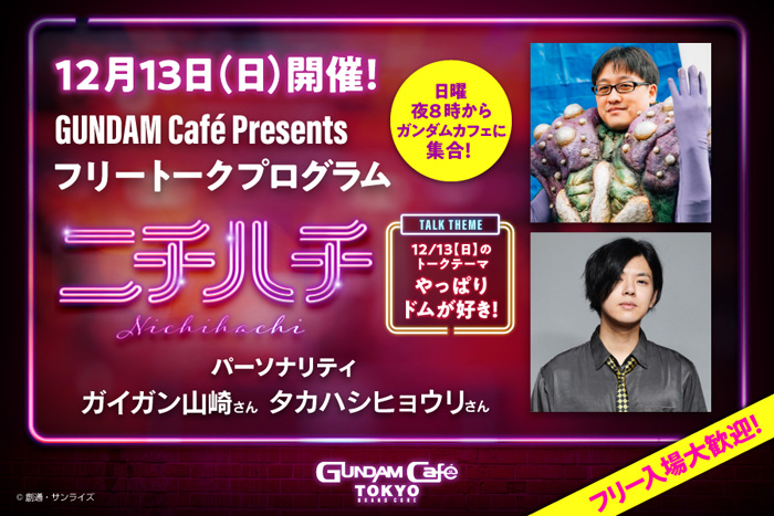 Dettagli sul programma di Talk gratuito Nichihachi, un evento che si terrà alle 8:00 PM di domenica, 13 dicembre presso il GUNDAM Café TOKYO BRAND CORE (GUNDAM Café TOKYO) esperienza ristorante intrattenimento basato sul servizio, sono stati rivelati.