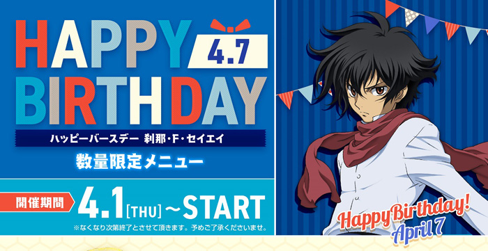 ConMOBILE SUIT GUNDAM 00Setsuna F. Seiei birthday il 7 aprile (mercoledì) e la buona risposta che abbiamo ricevuto circa il compleanno FortuneLattes, l'area del ristorante sarà anche celebrare il suo compleanno con un menu in edizione limitata.