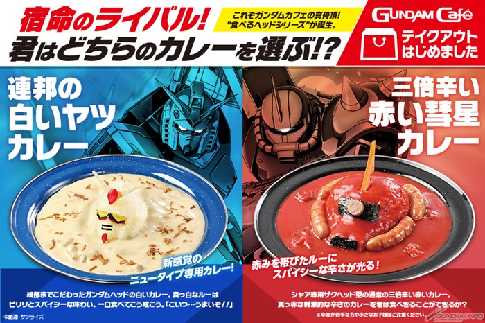 Ci saranno due GUNDAM Café originale curry: il bianco di The della Federazione e il tre volte spicier Red Comet curry, che è un curry "rosso" che raffigura la stessa Zaku di Char.