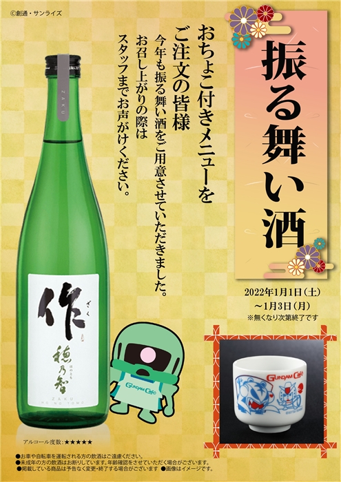 Per tutti i visitatori che scelgono di aggiungere la Coppa sake al loro ordine in qualsiasi momento tra il 1 ° gennaio (sabato) al 3 gennaio (Lunedi), hai anche il diritto di una tazza di sake su di noi.Assicuratevi di non perderlo!
