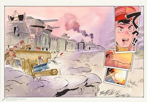 Yasuhiko ha ricordato com'era la scena dell'effetto di animazione all'epoca: "Quando Kawashiri (Yoshiaki) stava lavorando aMoomingli è stato affidato il compito di una scena con un'esplosione per qualche strana ragione, ed era entusiasta di questo. Si è seduto accanto a me e mi ha detto: "Ehi, dai un'occhiata!" Ma io non ero interessato e ho risposto: "Bene per te!" (ride). I titoli su cui Mushi Production ha lavorato non hanno avuto quasi nessuna esplosione, eMoominnon era un'eccezione. Pertanto, gli effetti delle esplosioni erano qualcosa di sconosciuto per me. Alla fine mi sono imbattuto in una scena di esplosione in una produzione di Sunrise.Zero Testr, e all'epoca l'ho affrontato usando una tattica subdola chiamata "esplosioni di sfondo". Scambiavamo lo sfondo con due o tre illustrazioni. Ho trovato questo metodo estremamente comodo e spesso dicevo allo staff: 'Fate un flash e poi scambiate il resto!' quando lavoravo ai titoli degli anime sui robot di Sunrise". Ha continuato: "Un giorno, ho chiesto a uno dei membri dello staff: 'C'è solo uno sfondo di esplosione. Ne servono almeno due. Dov'è finito l'altro?' Si è scoperto che uno di loro era caduto a terra e qualcuno lo aveva calpestato (ride). Potevo solo dire: 'Andiamo! Perché calpestare un'esplosione!' Incidenti come questi ci portavano a rimanere in ritardo rispetto alla tabella di marcia per quanto riguarda gli effetti. Ecco perché mi sono reso conto che questo sistema non avrebbe funzionato, e ho fatto le mie ricerche in preparazione per il primo episodio diMobile Suit Gundam"Questo potrebbe aver portato alla scena che hai menzionato prima." Ha rivelato la sorprendente storia dietro la nascita degli effetti che hanno fortemente influenzato Anno.