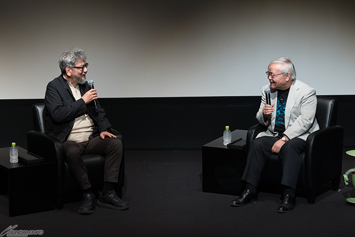 In mezzo a un fragoroso applauso, Yoshikazu Yasuhiko e Hideaki Anno sono apparsi sul palco. In primo luogo, il moderatore ha chiesto ad Anno quali fossero le sue impressioni sulla mostra di Yoshikazu Yasuhiko "Divino animatore e disegnatore", a cui ha risposto: "È una quantità di lavoro travolgente. Questa è stata la prima cosa che mi ha sorpreso. È davvero incredibile... Ho solo parole di lode. Beh, questo è il motivo per cui sono qui (ride)".