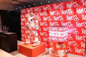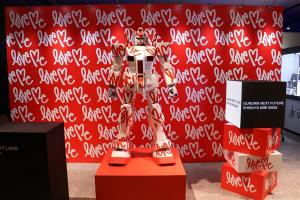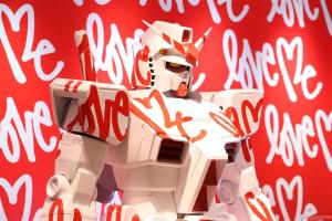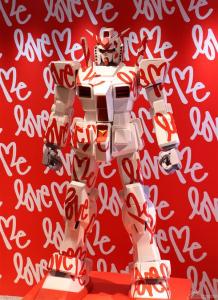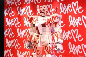 Un display di un impressionante, originale Gundam con una base bianca e rosso "Love me" lettering, lo stile rappresentativo di Curtis Kulig, un artista di New York, che è popolare in Giappone.