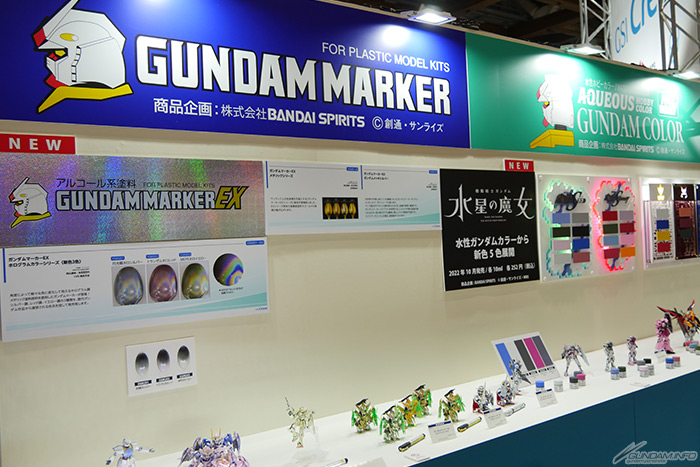 Allo stand di GSI Creos sono stati esposti più display che utilizzavano i marcatori Gundam.Cinque nuovi colori perfetti per GUNPLA dalMobile Suit Gundam la strega di mercurioserie sono stati visualizzati insieme ad esempi che sono stati dipinti con oro e argento Gundam marcatori.