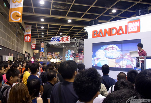 Displays of the Mobile Suit Gundam AGE trailer on the booth's stage drew quite a few viewers. After the showings, Executive Producer Miyakawa spoke about key points of the show. Many attendees dropped by to hear the latest about Gundam AGE.