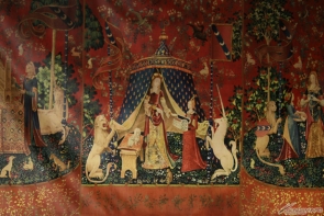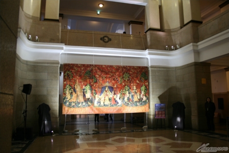▲石造りの重厚な玄関を抜けると、劇中でも印象的な「貴婦人と一角獣」が来場者をお出迎え。まずは、ロビーに設置されたスクリーンにて“シャアの再来”フル・フロンタルより歓迎の挨拶と、episode 1からepisode 5までのダイジェスト映像の上映が行われた。