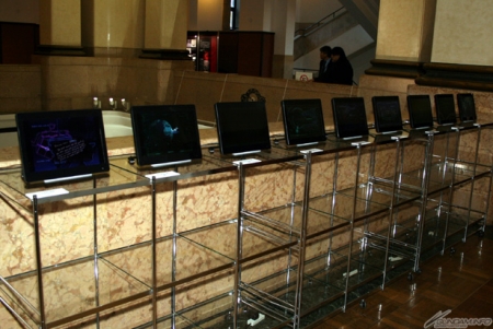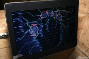 ▲ずらりと並ぶモニターには、劇中で使用されたモニターデザインが上映。特にユニコーンガンダムの生体認証のモニターは、ついつい手をかざしたくなる出来栄え!