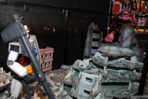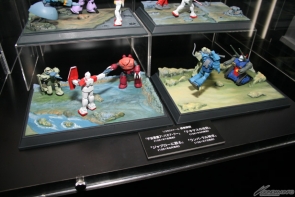 ▲時代毎のシャアの乗機のガンプラととともに、シャアが辿った軌跡を紹介する展示も。さらにガンダムとシャア専用ザクとの戦いを再現したジオラマも展示されている。