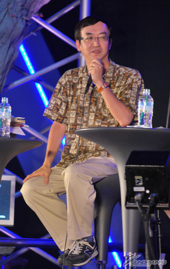 登壇してすぐに、傍らに設置されているコア・ファイターの巨大模型をまじまじと見つめる庵野さん。初めて見る巨大模型のコア・ファイターは、ディテールが気になっていたようだ。