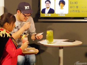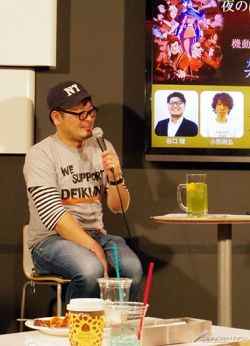 まずは両プロデューサーから挨拶があった後、ちょうど「シャア・アズナブルフェア」期間中ということで、谷口氏は「ドズル・ザビ~抹茶&緑茶酎ハイ~」を、小形氏は「クラウレ・ハモン~ジン&パルフェタムールベース~」を注文。観客と一緒に乾杯してトークショーは幕を開けた。