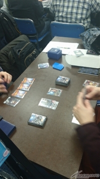 こちらは赤・緑・黄のデッキが多く見られた。また、混色のデッキも見受けられたが、決勝戦は緑デッキ対黄デッキの対決となった。