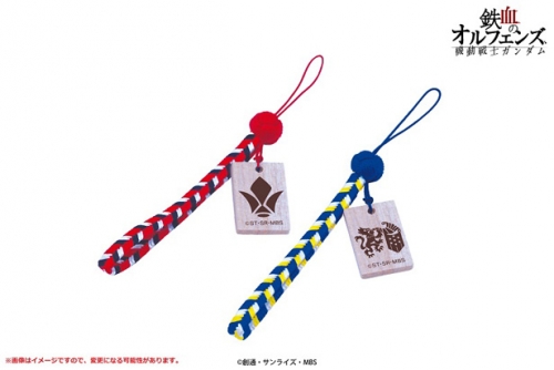 鉄華団やギャラルホルンをイメージし、赤や青をベースとして、職人の手により糸を一本一本丁寧に組み、木札に各組織のマークをあしらったストラップ。