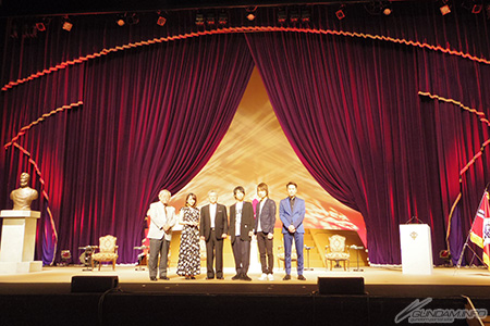 上映後のトークショーは、劇中に登場する「ジオン自治共和国国防軍士官学校」をイメージしたステージセットにて入学式という設定で実施され、“新入生”であるガルマ・ザビ役の柿原徹也さん、リノ・フェルナンデス役の前野智昭さん、シャア・アズナブル役の池田秀一さん、“来賓”であるセイラ・マス役の潘めぐみさん、安彦良和総監督が登壇。安彦総監督は、ステージ中央から豪華な椅子に座って登場し、「“公王”と呼んでいただきたい」と会場の笑いを誘うお茶目な一面も見せた。