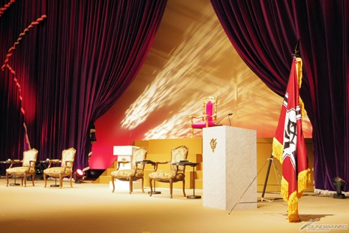 ▲ステージには「ジオン自治共和国国防軍士官学校」をイメージした豪華なセットが!
