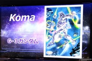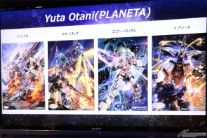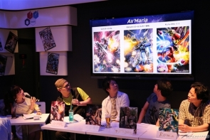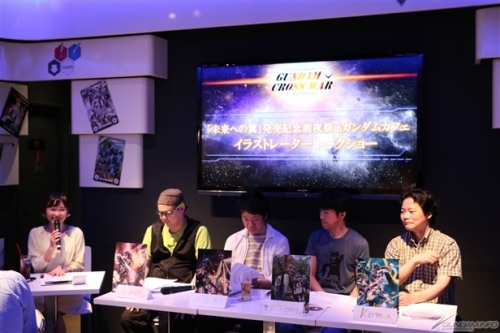 When asked about what other artists' work they enjoy in Cross War, they mentioned Naochika Morishita, who didn't appear on stage this time, and drew attention to a particular scene Morishita drew. When asked about what their favorite gundam work was, three of the artists selected "Mobile Suit Gundam", but when Otani chose "Gundam Build Fighters", the audience let out a gasp of surprise.