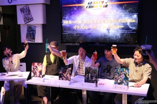The event started off with a toast commemorating the launch of the "Wings to the Future" booster pack. The speakers then introduced themselves, chose their favorite mobile suit, and what they would like people to pay attention to in their works.