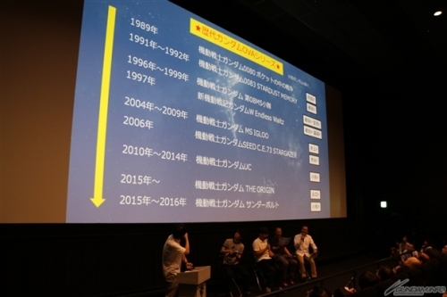 まず会場のスクリーンに歴代ガンダムOVAシリーズのタイトルと、各担当プロデューサーがまとめられた表が映し出され、この表を見ながら制作の裏側についてトークが展開されていく。