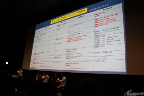 次に、テーマは「サンライズの主なスタジオ」へと移る。スクリーンには、「ガンダム制作スタジオの変遷」というタイトルで、第1、第2、第3、第5スタジオのそれぞれが1988年から1997年にかけて制作してきた作品をまとめた表が映し出された。あまりにもマニアックな資料だが、谷口プロデューサーが「皆さん楽しいんですか?」とたずねると、会場からは拍手が巻き起こる。