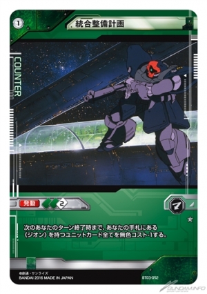 ▲「統合整備計画」は、“次のターン中、手札にある「ジオン」のユニットの無色コストを-1する”効果を持つ特殊なカウンター。やまこ~さんのデッキは、「高機動型ザクII後期型(ジョニー・ライデン機)」や「シャア専用ザクII」など、強力なドロー能力を持つユニットを駆使して手札の枚数を増やし、「統合整備計画」でその手札を一気に展開して、瞬発的に大打点を叩き出すのがコンセプトだ。