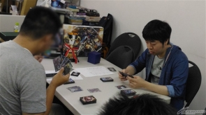 1戦目は、ぐふさんの先攻。しかし、序盤に先手を打ったのは、やまこ~さん。「マゼラ・アタック」、「ザクI(ノリス機)」、「ザクII改」+「マッシュ」と猛攻をかける。一方、ぐふさんも一手遅れながら、「ジェガンD型」、「ガンキャノン」+「三日月・オーガス」、「ザクキャノン」+「メガライダー」×2枚と順に展開し、一歩も譲らぬ構え。