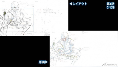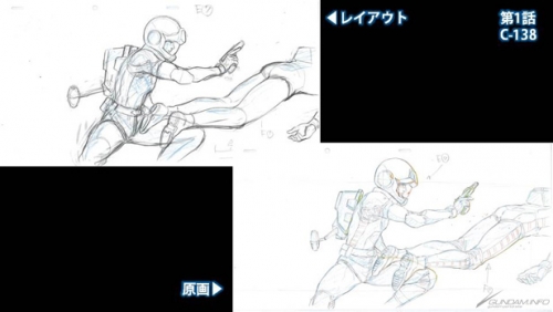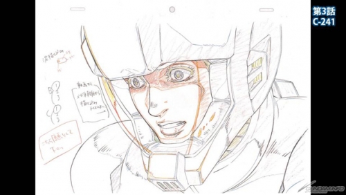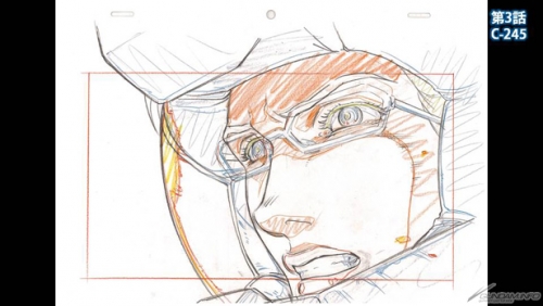 続いて、実際に田頭さんが担当したシーンをスクリーンで見ながらの説明へ。第1話の「イオがフーバーを殺すシーン」では、初めに「レイアウト」というラフをつくり、演出や作画監督の指示が入って「原画」になる、という流れが解説された。また、「カーラが機銃座で撃っているシーン」では、「見えないところをしっかり描く」ために、メガネを別セルで描いたそうだ。