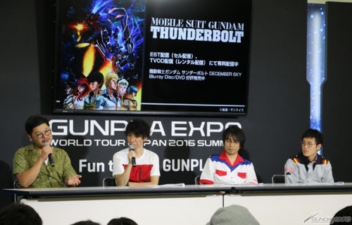 On August 14th (Sun) on the final day of “Gunpla EXPO World Tour Japan 2016 SUMMER” held at Sunshine City, Ikebukuro, wonderful guests were invited to hold a talk show at the venue called “Fun to build! GUNPLA stage.” At the talk show titled The World of Universal Century featuring THE ORIGIN, Thunderbolt, and Unicorn RE:0096, THE ORIGIN’s producer Osamu Taniguchi, Thunderbolt as well as Unicorn RE:0096’s producer Naohiro Ogata, Bandai Hobby Department’s Mr. Takumi Uchida and Mr. Mizuki Fukuda went up on stage. They held a talk show focusing on the works that took place in the Universal Century timeline and the latest news and Gunpla with Ms. Kaede Okutani as the MC.