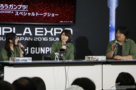 On the final day of Gunpla Expo World Tour Japan 2016 Summer at Ikebukuro Sunshine City, special guests Yuki Kuwahara and Sayaka Senbongi, voices of Cookie and Cracker Griffon in Mobile Suit Gundam: Iron-Blooded Orphans, took to the Fun To Build! Gunpla stagr. Kaede Okutani MCed a discussion about Iron-Blooded Orphans Gunpla as the pair built their own.