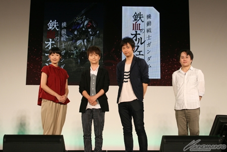 Kengo Kawanishi (voice of Mikazuki Augus) Yuka Terasaki (voice of Kudelia Aina Bernstein), producer Masakazu Ogawa, and special guest Ryota Osaka were there to talk about the second season of Iron-Blooded Orphans, premeiring October 2nd, in which Osaka will play new character Hush Middy.
