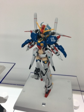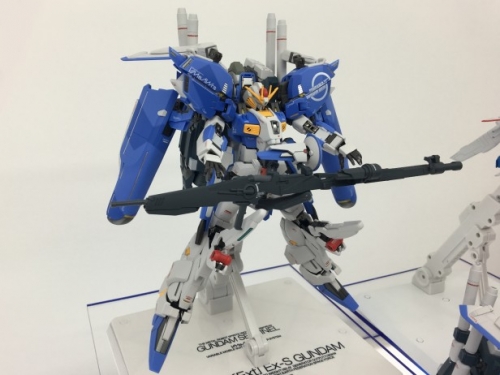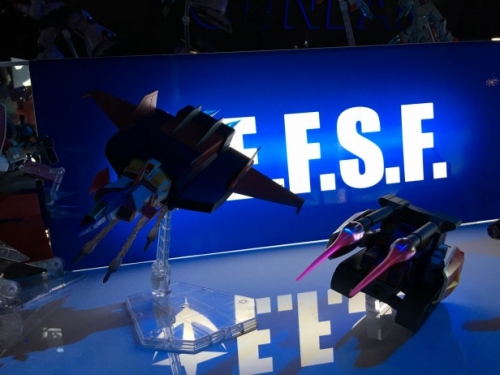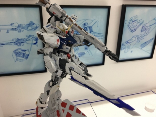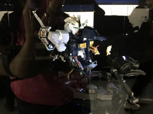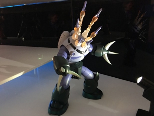 This display uses a real type Gundam to recreate the poster image ofthe theatrical release of Mobile Suit Gundam released in 1981. The identical movie poses were made possible through a special method where the illustrator applied form, coloring, and markings with an image of Zaku printed on cardboard placed in the back! Through the image that the products conveyed, I could recall the memories and excitement of those days!
