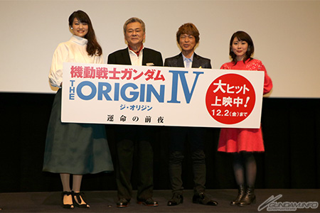Screening theaters countrywide for the Mobile Suit Gundam THE ORIGIN IV Eve of Destiny 2-week screening event are being visited by staff and cast members and will end on December 2nd (Fri.) Stage greetings were held at TOHO Cinemas Nihonbashi in Tokyo on November 27th (Sun.)