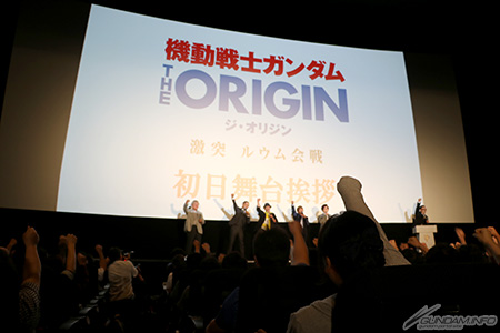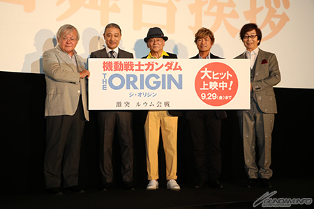 The opening day stage greetings took place at Marunouchi Piccadilly in Tokyo where Mr. Shuuichi Ikeda, voice of Char Aznable, Mr. Banjo Ginga, voice of Gihren Zabi, Mr. Toru Furuya, voice of Amuro Ray, Mr. Toshio Furukawa, voice of Kai Shiden, and General Director Yoshikazu Yasuhiko took the stage.