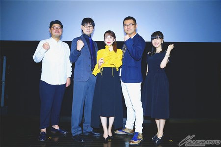 Stage greetings for the second week of screenings for Mobile Suit Gundam THE ORIGIN: Clash at Battle of Loum, currently a big-hit screening event at 35 theaters nationwide, took place on September 9th (Sat) at Kawasaki CINECITTA in Kanagawa. This time, Ms. Megumi Han, voice of Sayla Mass, Mr. Shigeo Kiyama, voice of Ramba Ral, Mr. Kenta Miyake, voice of Dozle Zabi, and Ms. Ai Kayano, voice of Zenna Zabi, along with Producer Osamu Taniguchi took the stage.