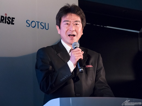 ▲ From the left, Sotsu President Mr. Takashi Izuhara, BANDAI Managing Director Mr. Yoshitaka Tao, Fuku Suzuki, Sunrise Director Mr. Shin Sasaki, and Sunrise Producer Mr. Masakazu Ogawa
