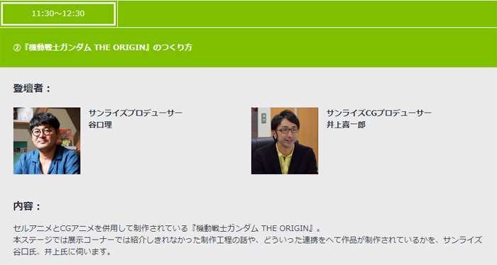 "THE ORIGIN" producer Osamu Taniguchi and CG Producer Kiichiro Inoue will apear and talk about using cel and CG animation together, the production process, and how the collaboration process works during the production process.