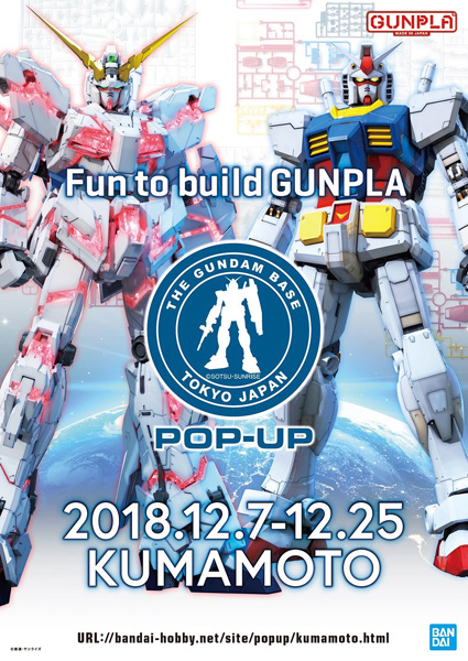 "IL GUNDAM BASE TOKYO POP-FINO a KUMAMOTO" è una versione condensata della struttura gunpla "IL GUNDAM BASE TOKYO" e sarà al Parco di Kumamoto inizio 7 dicembre, 2018 (Ven) al Parco di Kumamoto. L'ingresso è gratuito