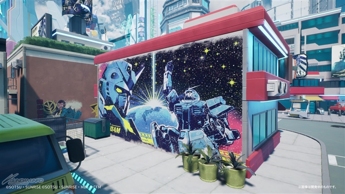 La hall principale è piena di veicoli e oggetti della serie Gundam, pubblicità di aziende che i fan di Gundam potrebbero notare e street art con motivi di vari titoli di Gundam. Alcune opere d'arte sono anche ricreazioni di luoghi famosi che esistono nel mondo reale.